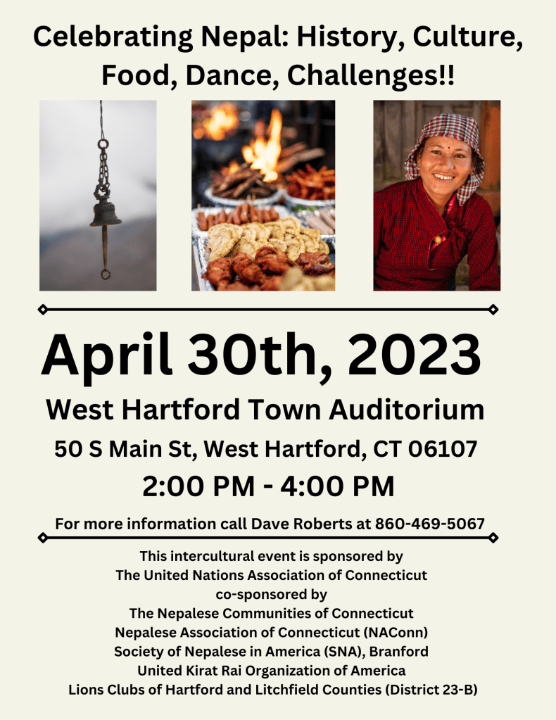 Join us on April 30, 2023, at 2:00 pm at the West Hartford Town Auditorium, 50 S Main St, West Hartford, CT, to Celebrate Nepal: The History, Culture, Food, Dance, and Challenges!!!